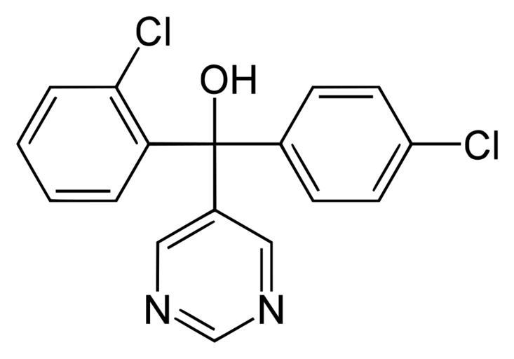 Keywords: Fenarimol.svg fenarimol; Rimidin; Rubigan Own 2008-05-08 Yikrazuul Tertiary alcohols Pyrimidines Monochlorobenzenes Poisons Diphenylmethanes Fungicides