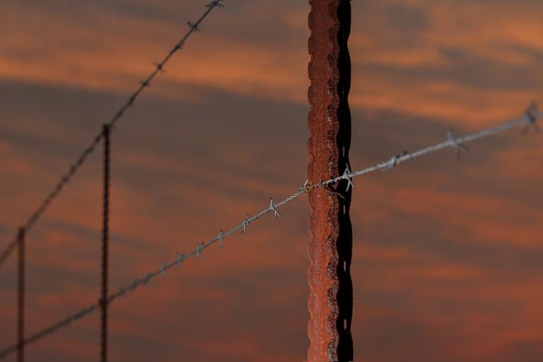 Keywords: fence barbed wire fence post rusty sundown sunset barrier barbwire farm enclosure boundary