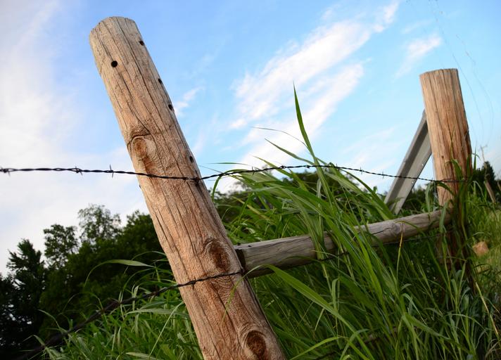 Keywords: fence post barb wire wire fence barbed post rural field meadow sky green grass outdoor blue nature countryside farm scenic agriculture wooden fencing spring day