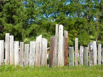 Keywords: fence telephone poles wooden fence poles grass trees outdoors wood