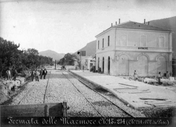 | Keywords: Ferrovia Terni-Rieti-L'Aquila (1883) - stazione di Marmore.jpg it Fermata di Marmore Immagine tratta dalla raccolta di fotografie sulla costruenda ferrovia Terni-Rieti-L'Aquila realizzata da Achille Mauri per conto della Società Italiana per le strade ferrate meridionali e pubblicata nell'ottobre 1883 1883-10 https //www facebook com/photo php fbid 422050781295216 set a 118426424990988 24141 100004708923017 type 1 theater Mario Scardaoni Achille Mauri other versions PD-old-70-1923 Marmore train station |