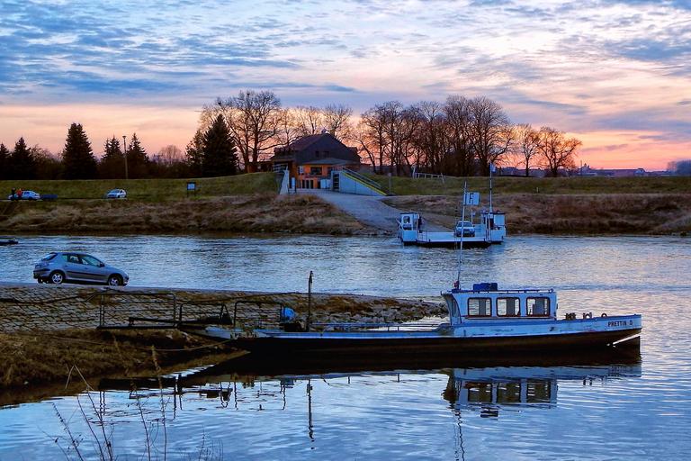 Keywords: ferry reaction ferry elbe ferry car ferry elbe ferry prettin landscape river elbe sunset water clouds cumulus clouds