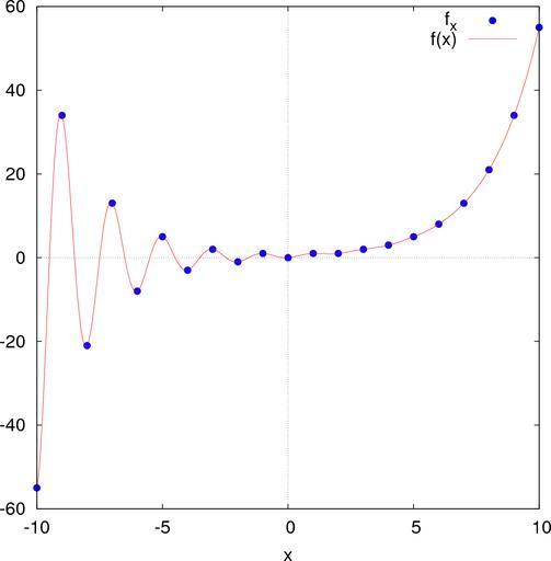 | Keywords: Fibonacci continuous.png Plot of Fibonacci number function of a continuous variable own Fredrik Johansson Maxima source code xy makelist n fib n n -10 10 ; f n realpart phi n- - phi -n /sqrt 5 ; plot2d discrete xy f x x -10 10 style points 3 1 lines 1 2 legend f_x f x gnuplot_preamble set size ratio 1; set zeroaxis; nticks 100 gnuplot_term ps Fibonacci numbers Special functions |