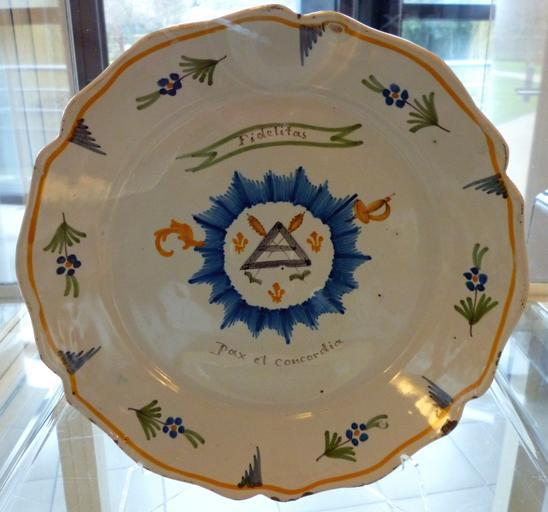 Keywords: Fidelitas assiette.jpg en The center shows a square the freemasonry symbol over 2 ears cereal plants The square Third Estate is surrounded by 3 fleurs de lys symbols of royalty To the left is a crosier of a bishop symbol of the clergy and to the right the pommel of an épée symbol of the nobility Fidelitas pax et concordia means fidelity peace and concord own Stanzilla Anonymous or 1790 1791 Faience of Nevers on the French Revolution 1790s works in France Masonic artifacts Files by User Stanzilla Plates of France Faience in the Musée des Beaux-Arts de Bernay Cc-zero |