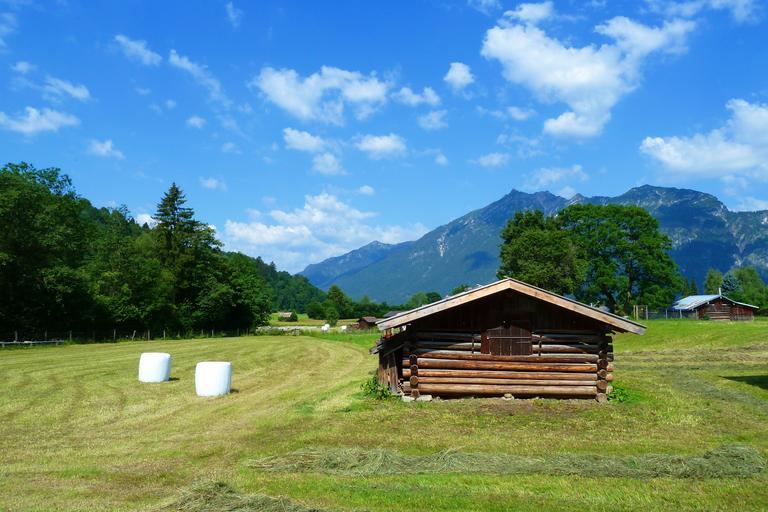 Keywords: field hay balls log building shed mountains alp garmisch partenkirchen bavaria germany scenery landscape naure