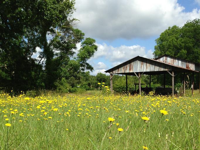 Keywords: field rural flowers yellow grass shed meadow environment idyllic outdoors agriculture uncultivated natural tranquil trees wildflower land pasture
