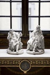 Keywords: Figur. 2 st - Hallwylska museet - 87175.tif Statyett av biskvi Den franske dramatikern Pierre Corneille 1606-1684 sitter i en länstol författande en dikt I handen håller han några pappersblad varpå läses titlarna på en del av hans arbeten; Le Cid Horace Cinna och Polyceute m fl På fotplattans otydligt ristat FAIT PAR J J CAFFIERE EN 1779 Modellerad efter Jean Jacques Caffieris originalskulptur från 1779 Beställningen av denna skulptur daterar sig från 1778 och marmorstatyn som i våra dagar befinner sig på Louvren ställdes ut på Parissalongen år 1779 I museet i Rouen författarens födelseort finns även ett exemplar i terrakotta i naturlig storlek och hans mest kända pjäser omnämns där med titel Lerskulpturen i mindre skala som tillverkades i Sèvres betalades till Caffiéri den 6 april 1784 och skulpturen av Molière den 22 januari 1785 2 Troligtvis på grund av utrymmesbrist på den förminskade modellen förkortades inskriptionerna på sockeln av Corneilleskulpturen en aning De många sprickorna efter bränningen och Le Riches stämpel gör att det faktiskt rör sig om ett exemplar från 1700-talet Det är i så fall det enda existerande exemplaret Då han möjligtvis kände sig uppmuntrad av detta samarbete erbjöd Caffiéri år 1788 fabriken i Sèvres modeller och gipsformer till två statyettgrupper Vänskapen överraskad av Amor och Amor besegrar allt Men de kom aldrig i produktion 3 2 Manufacture nationale de Sèvres Arkiv Register Vf 34 folianter 5 och 25 3 Ibidem kartong H4 innehållande korrespondens i detta ämne Pris 450 Kr Se Toilettbok 23 dec 1902 original caption Figur 2 st HWY Gr XLVII IV R b a 02 <br/> Nyckelord Figurer Män Skulptur Föremålsbild 1783 size cm 22 2 fotplatta size cm 23 fotplatta size cm 36 HWY place of origin Sèvres FR original filename hm_dig4814_6120 17971 inventory number HWY XLVII IV R b a 02 87175 CC-BY-SA Jens Mohr Jens Mohr Porcelain in the Hallwyl museum Media contributed by LSH dim-with multiple size templates Media contributed by LSH unmatched keyword Sèvres porcelain biscuit figures Media contributed by LSH 2013-10 |