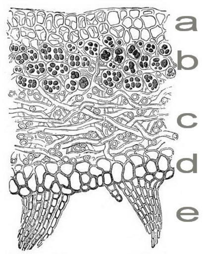 Keywords: File-Meyers b6 s0351a.jpg Diagram of Sticta fuliginosa with layers a/b/c/d/e Bild von Sticta fuliginosa mit a/b/c/d/e Ст оение гете оме ного лишайника на п име е Sticta fuliginosa a - ко ковый слой b - гонидиальный слой c - се дцевина d - нижняя ко а e - изины Meyers b6 s0351 jpg - 1885 1890 author PD-Meyers Lichen anatomy and morphology Sticta fuliginosa Images from Meyers Konversationslexikon 4th edition - text figures Meyers b6 s0351 |