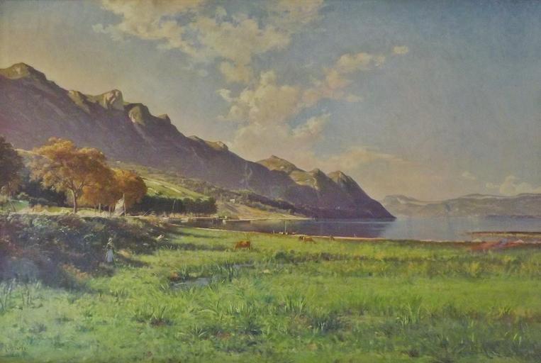 | Keywords: Fin d'été en Savoie, le lac du Bourget (J. Morion).JPG  en Sight of the lac du Bourget lake from Le Bourget-du-Lac Savoie France during the 19th century fr Vue sur le lac du Bourget depuis Le Bourget-du-Lac Savoie au XIXème siècle title fr Fin d'été en Savoie Le lac du Bourget oil on canvas 131 x 196 cm Palais de Justice de Chambéry Salles des Pas perdus Jacques Morion 1863 - 1904 1850 - b 1900 accession number M 1381 ; 499 Ancien numéro ; Bord 189 Autre numéro Florian Pépellin PD-old-70 Historical images of Savoie Le Bourget-du-Lac Paintings in Savoie |