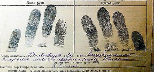 | Keywords: Fingerprints of Anna Timiriova 3.jpg en Fingerprints of Anna Timiriova taken by soviet police at her arrest in 1950 Последняя любовь Колчака снималась у Гайдая и Бонда чука http //www kp ru/daily/24182 3/390605/ Police Files 1950-01-27 PD-RU-exempt Anna Timiriova Fingerprints |