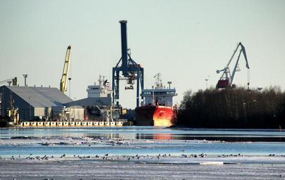 Keywords: finland harbor ship sky clouds buildings cranes outside winter snow ice architecture bay