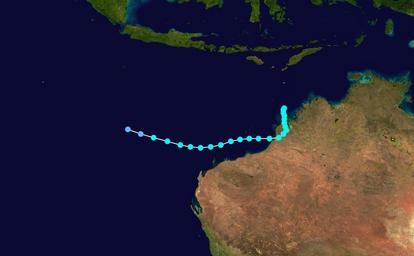 Keywords: Fiona-Gwenda 1974 track.png Track map of Cyclone Fiona-Gwenda of the 1973-74 Australian region cyclone season The points show the location of the storm at 6-hour intervals The color represents the storm's maximum sustained wind speeds as classified in the Saffir-Simpson Hurricane Scale see below and the shape of the data points represent the nature of the storm according to the legend below User Nilfanion/Tc/T The background image is from NASA Tracking data is from http //jtwccdn appspot com/NOOC/nmfc-ph/RSS/jtwc/best_tracks/wpindex html JTWC 2013-06-23 Supportstorm Tropical cyclone tracks 1973-74 Australian region cyclone tracks Australian region tropical cyclone tracks |