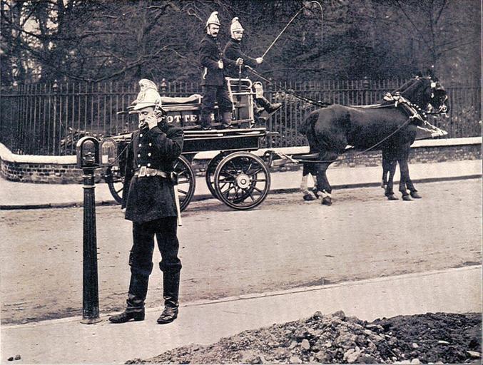 Keywords: Fire-alarm telephone (Rankin Kennedy, Electrical Installations, Vol V, 1903).jpg Telephone boxes in London Early telephones 1903 in London Police boxes in London Unidentified locations in London Emergency telephones
