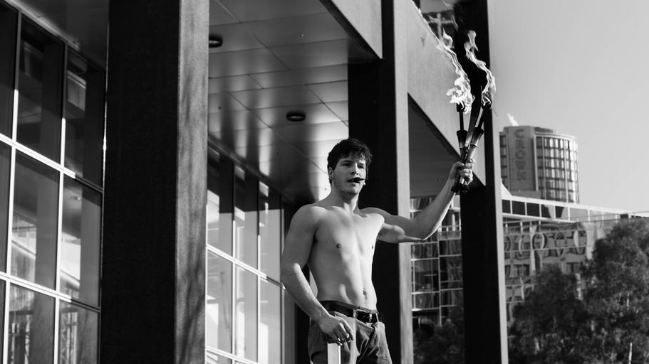 Keywords: fire eating performer entertainment stage people perform live event audience street artist melbourne street male guy attraction casual confident danger
