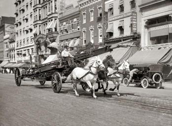 | Keywords: Fire truck on F Street - Washington, D.C..jpg en A fire truck pulled by three horses races down F Street NW in Washington D C 4899 Harris Ewing 1914 PD-Harris-Ewing PD-US 1914 in Washington D C Fire horses Firefighters in Washington D C Historical fire engines of Washington D C F Street Horse-drawn fire engines in action Black and white photographs |