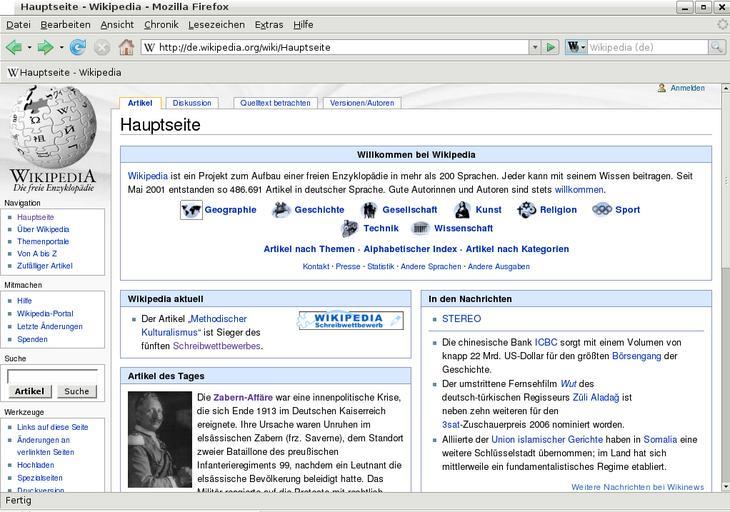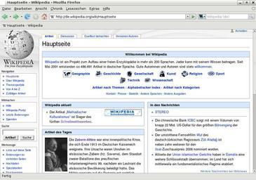 | Keywords: Firefox 2 de.png  Mozilla Firefox 2 0 runnig under Debian GNU/linux 3 1 GNOME displaying the German Wikipedia Main Page/ Mozilla Firefox 2 0 unter Debian GNU/Linux GNOME mit der Hauptseite der deutschsprachigen Wikipedia Own October 28th 2006/ 28 Oktober 2006 n Chr MF-Warburg<small> de </small> free screenshot <br/>Software GPL LGPL MPL Wikipedia logo Cc-by-sa-3 0 Wikimedia trademark Text of Wikipedia and the P-xyz-lightblue png images in Willkommen bei Wikipedia GFDL relicense The image of emperor Wilhelm II PD-USGov Screenshots of Mozilla Firefox 2 x with German Debian screenshots German Wikipedia screenshots |
