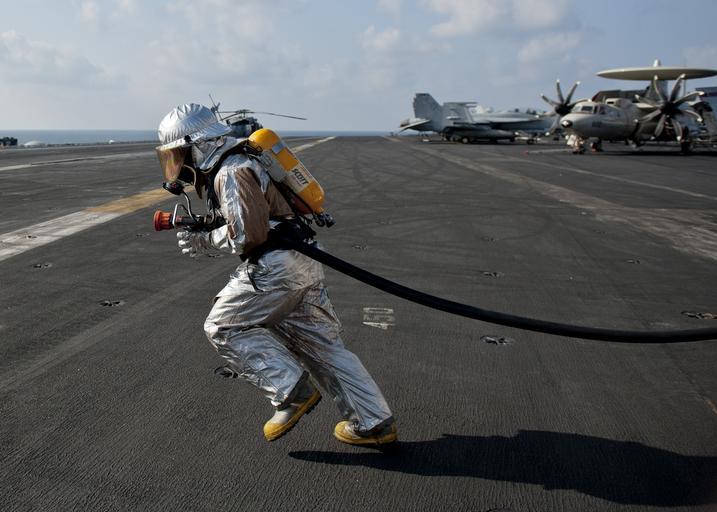 Keywords: fireman firefighter water helmet safety equipment firefighting hose practice training sailor navy military ship vessel nautical flight deck aircraft carrier