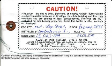 Keywords: Firestop tag front.jpg Firestop tag front identifying installer location and certification listing that bounds the installed configuration This tag was printed on Tyvek for durability It has an eyelet and a stainless steel wire for securing onto the firestop or a penetrant Own 2007-06-24 Achim Hering Firestop tags caution Tyvek |