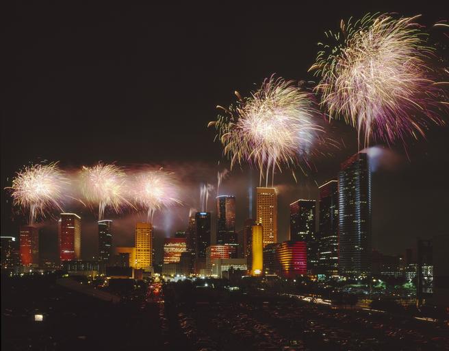 Keywords: fireworks celebration night city houston texas urban buildings architecture festive explosion party lights colorful black illumination skyline night sky landscape usa
