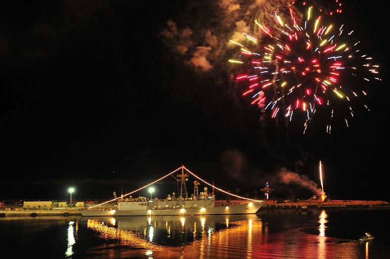 Keywords: fireworks night evening mayport florida reflections harbor port bay water ship battleship navy military shoreline beautiful outside