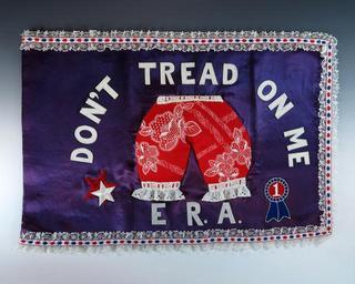 Keywords: First Lady Betty Ford’s “Bloomer Flag”.jpg en The purple satin background is trimmed in white lace with a blue and red star border The pair of red and white bloomers in the center is a play on Betty's maiden name White text above the bloomers reads Don't Tread on Me and below E R A - demonstrating Betty s support for the Equal Rights Amendment A wife of one of Betty s staffers handmade it for her as a limousine flag Gerald R Ford Presidential Museum 1981 n/a Institution Institution Gerald R Ford Presidential Museum Accession Number 1981 138 6 Dimensions 14 x 21 Gerald R Ford Presidential Library and Museum-cooperation PD-USGov Miscellaneous objects in the collection of the Gerald R Ford Presidential Museum Betty Ford Equal Rights Amendment Bloomers |