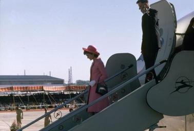 Keywords: First Lady Jacqueline Kennedy stepping off the plane at New Delhi, India.jpg en First Lady Jacqueline Kennedy walks down airplane stairs upon arrival at Palam Airport in New Delhi India United States Ambassador to India John Kenneth Galbraith walks behind Mrs Kennedy at right 1962-03-12 http //www jfklibrary org/Asset-Viewer/Archives/JFKWHP-1962-03-12-E aspx Cecil Stoughton other versions PD-USGov Jacqueline Kennedy Onassis in India Integrated side gangways aircraft Uploaded with UploadWizard John Kenneth Galbraith Indira Gandhi International Airport |