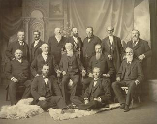 Keywords: First Presidency and Twelve Apostles 1898.jpg The First Presidency and the Twelve Apostles Standing from left to right Anthon Hendrik Lund John William Taylor John Henry Smith Heber Jeddy Grant Francis Marion Lyman George Teasdale Marriner Wood Merrill Seated from left to right Brigham Young Jr George Quayle Cannon Lorenzo Snow Joseph F Smith Franklin Dewey Richards Front row from left to right Matthias F Cowley and Abraham Owen Woodruff At the date on this photograph September 1898 there were only eleven members of the Quorum of the Twelve Apostles Wilford Woodruff had just died Sept 2 and Lorenzo Snow was called from the Quorum to become the next president Sept 13 The vacancy in the Twelve would be filled the next month when Rudger Clawson was ordained Oct 10 Some captions or revisions to this photograph have included Clawson or Reed Smoot ordained 1900 See also other versions below Immediate image source http //contentdm lib byu edu/cdm4/item_viewer php CISOROOT /Savage2 CISOPTR 1513 CISOBOX 1 REC 10 C R Savage collection Brigham Young University call number PH 2749 Marked Copyrighted September 1898 C R Savage in the lower left corner Digital version published September 2005 at Brigham Young University Creator Charles Roscoe Savage The source states Public Domain; Courtesy Church History Collections The Church of Jesus Christ of Latter-day Saints and Intellectual Reserves Inc http //contentdm lib byu edu/cdm4/item_viewer php CISOROOT /Savage CISOPTR 1334 CISOBOX 1 REC 9 Call number MSS P 24 Item 793 is another version of this photo with Reed Smoot pasted in between Taylor and J H Smith in the back row and Rudger Clawson between Teasdale and Merrill PD-old-100 Matthias F Cowley Marriner W Merrill Lorenzo Snow Joseph F Smith John W Taylor Mormon John Henry Smith Heber J Grant George Teasdale George Q Cannon Franklin D Richards Mormon apostle Francis M Lyman Brigham Young Jr Anthon H Lund Abraham O Woodruff 1898 photographs Group photographs Apostles of The Church of Jesus Christ of Latter-day Saints Group 1898 Members of the First Presidency of The Church of Jesus Christ of Latter-day Saints Group 1898 with the Twelve Images by Charles Roscoe Savage Group portraits with 14 persons |