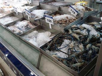Keywords: Fish food Udonthani WD1.JPG en fish packed in ice supermarket Tesco-Lotus Udonthani Thailand own Wolf-Dieter 2008-07-13 see also Fish food Udonthani WD2 JPG Crustaceans in Thai cuisine Fish markets in Thailand Macrobrachium rosenbergii