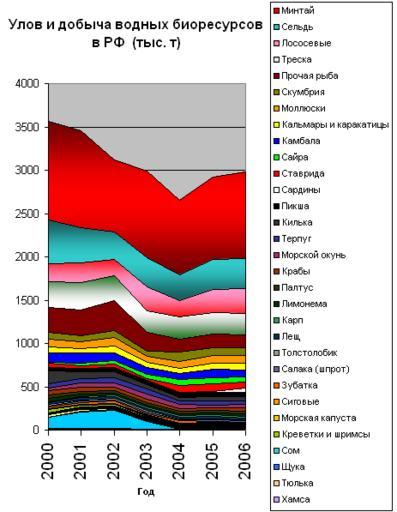 Keywords: Fish Russia Statistics.png Улов и добыча водных био есу сов по видам в Российской Феде ации по годам Российский статистический ежегодник 2007 ст 489 User X-romix standard - Улов и добыча водных био есу сов по видам в РФ по годам 2000 2001 2002 2003 2004 2005 2006 - интай 1140896 1120889 831179 1003009 857460 948233 1002958 - Сельдь 499363 402839 314602 343458 298510 349859 351734 - Лососевые 208194 224458 191694 271370 183728 260376 281773 - Т еска 299650 322112 283453 246154 261288 252015 249642 - П очая ыба 292386 298431 349355 223522 144826 160129 144319 - Скумб ия 75031 62519 82144 53005 111640 83687 93353 - оллюски 93045 79560 93361 69220 74631 90735 89901 - Кальма ы и ка акатицы 66133 52090 78188 58926 66317 74056 80099 - Камбала 106461 114139 88177 85101 67724 91760 73636 - Сай а 13698 35884 44302 50895 71216 75453 67138 - Став ида 50296 25118 41695 18277 71590 83948 65383 - Са дины 11811 3544 9108 4815 6014 13603 51743 - Пикша 28642 41060 40598 43479 55408 50001 51533 - Килька 149478 79392 69232 52656 42549 46749 45218 - Те пуг 42563 50534 55744 59108 43469 46051 41998 - о ской окунь 32948 46620 47609 53638 44591 37484 40401 - К абы 51985 46903 41904 43046 32940 30298 40351 - Палтус 36805 28772 27625 25030 24601 23859 25763 - Лимонема 37211 31891 24445 24396 22473 24461 24854 - Ка п 11856 15515 16125 18529 17276 19804 22529 - Лещ 20661 23676 24435 22240 20772 28235 20117 - Толстолобик 13976 12624 14308 13596 11777 11785 14037 - Салака шп от 10777 17851 16343 23985 11253 13744 12560 - Зубатка 21506 22242 23705 14177 24555 14284 11818 - Сиговые 10728 9987 9260 9640 9983 11529 11066 - о ская капуста 5261 3022 7788 3618 8857 6653 8217 - К еветки и ш имсы 32366 17782 12210 9734 10289 9176 7299 - Сом 6222 4826 5268 5541 4638 5404 7151 - Щука 6760 7258 7675 8273 6152 6440 7062 - Тюлька 4221 7664 10145 8101 7431 6657 6928 - Хамса 3492 4049 3827 8244 9475 6695 5624 - Т убач 3338 3173 4645 3871 2309 9875 5264 - Иглокожие 807 1071 1879 1956 1184 2644 3821 - о ской г ебешок 23010 23283 9724 5818 4060 5674 3080 - Сазан 4136 2626 2552 2376 4282 2365 2719 - Судак 5071 4571 5049 4316 2814 2790 2678 - ойва 126869 189846 213196 87083 2251 2876 2261 - Вобла та ань 6889 6726 6622 4606 1684 1663 2021 - Д угие водо осли 451 1607 1659 4056 311 1034 1439 - Скаты 5301 4112 3105 4144 5283 2001 1377 - идии и уст ицы 85 58 33 37 134 146 938 - о ской ка ась 1498 824 461 506 711 2120 812 - Осет овые 539 622 491 513 191 299 441 - Тунец 1247 625 363 32 25 37 438 - о ской зве ь 1001 866 1092 308 31 7 369 - Киты 104 122 1658 683 347 - Аму 143 188 159 252 246 332 336 - Акулы 3 1 40 145 - Уго ь 23 57 53 54 59 56 51 - Раки 1 4 4 6 11 10 5 - инога 1 5 1 55 2 - Бе икс 18 223 92 51 71 297 0 - Рыба сабля 90 190 167 39 90 0 Commercial fishing |