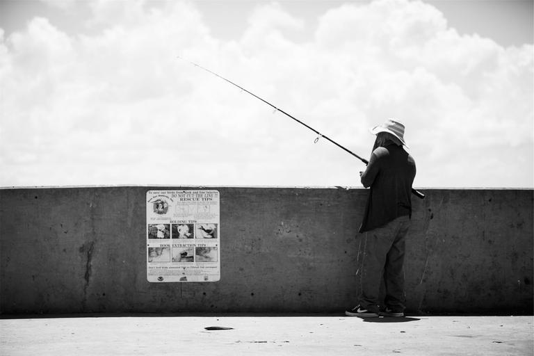 Keywords: fisherman fishing rod pier black and white