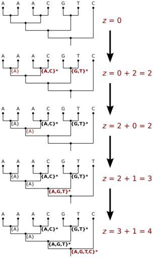 Keywords: Fitch algorithm rooted tree.svg en A demonstration of Fitch ™s algorithm to calculate the total number of steps for a rooted phylogeny tree 2013-01-16 02 33 55 own Chen-Pan Liao created with Inkscape cc-zero Uploaded with UploadWizard Algorithms Phylogenetics |