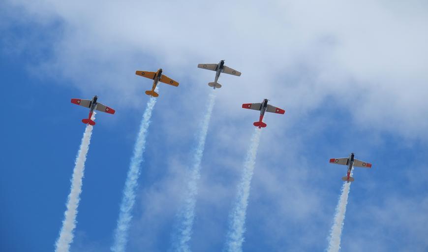 Keywords: Five Harvards climbing into a looping in formation.jpg Five Harvards ex-RNZAF flying looping in formation with smoke trails North American T-6 Texan Harvard Private New Zealand Warbird display team The Roaring Forties Photograph Hood Aerodrome Masterton New Zealand 2015-01-17 Pseudopanax wikipedia en Own 40 58 0 S 175 40 0 E T-6 Texan warbirds Wings over Wairarapa 2015 Aircraft formation flight Smoke trails of aerobatic teams |