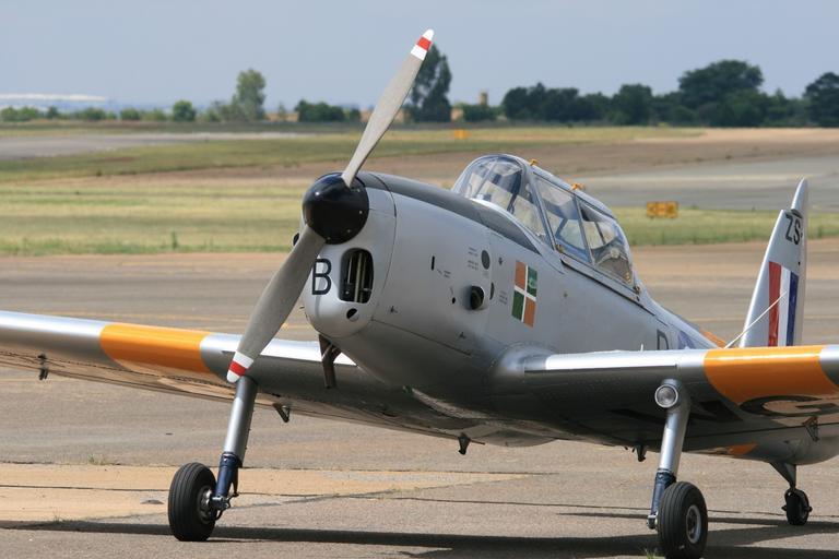 Keywords: fixed wing aircraft chipmunk silver yellow parked south african air force museum heritage