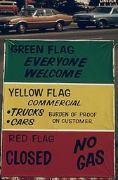Keywords: FLAG POLICY DURING THE 1973 oil crisis.gif GASOLINE DEALERS IN OREGON DISPLAYED SIGNS EXPLAINING THE FLAG POLICY DURING THE FUEL CRISIS IN THE WINTER OF 1973-74 AS THE SIGN SAYS THE GREEN FLAG MEANS ANYONE CAN GET GAS THE YELLOW IS FOR COMMERCIAL VEHICLES ONLY AND A RED FLAG MEANS NO GAS AT ALL NARA-image 555518 1974-05 PD-USGov PD-USGov Gas stations in Oregon Signs in Oregon 1974 in Oregon Energy crises DOCUMERICA 1973 oil crisis Green red yellow |