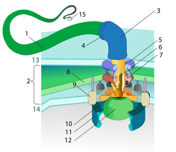 | Keywords: Flagellum base diagram keys.svg see en talk page Image moved from File Flagellum bacterial numbered svg Numbered version from Image Flagellum base diagram en svg A Gram-negative bacterial flagellum --- Flagellum plural flagella is a long slender projection from the cell body Its function is usually to propel a unicellular or small multicellular organism Own 2008-03-04 Mariana Ruiz Villarreal LadyofHats Other versions/Flagellum base diagram LadyofHats Bacteria diagrams Procaryota cell diagrams Flagella Diagrams labelled with numbers only |