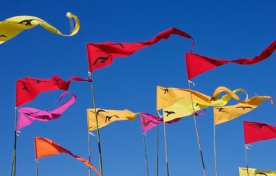 Keywords: flags pennants red yellow blue sky flutter blowing colourful triangular sculpture art contemporary modern australia exhibition