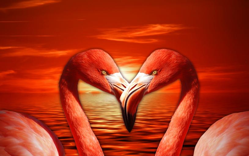 Keywords: flamingo valentine heart valentine's day love romantic lovers red orange salmon pink decorative animal bird beaks sunset clouds sky evening sky abendstimmung sea sun nature mood atmospheric sunbeam romance twilight