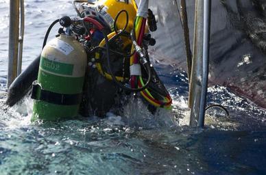 Keywords: Fleet Readiness Training Program 130618-N-YD328-234.jpg en Navy Diver 1st Class Brett Harkey and Navy Diver 2nd Class Robert LaFrance both assigned to Mobile Diving and Salvage Unit Two MDSU2 begin a descent through the water column on a diving stage aboard USNS Grasp T-ARS-51 during MDSU2's Fleet Readiness Training Program FRTP in Key West Fla FRTP is an ongoing two-year training pipeline encompassing all required skills for a MDSU2 company deployment Training aboard USNS Grasp is conducted with members of the Military Sealift Command who operate the ship and provide support for the Navy Divers U S Navy photo by Mass Communication Specialist 3rd Class Nicholas S Tenorio/Released 2013-06-18 Petty Officer 3rd Class Nicholas Tenorio https //www dvidshub net/image/959551 130618-N-YD328-234 2013-06-24 13 15 KEY WEST FL US 3 PD-USGov-Military-Navy United States Navy Mobile Diving and Salvage Unit Two Images from DoD uploaded by Fæ |