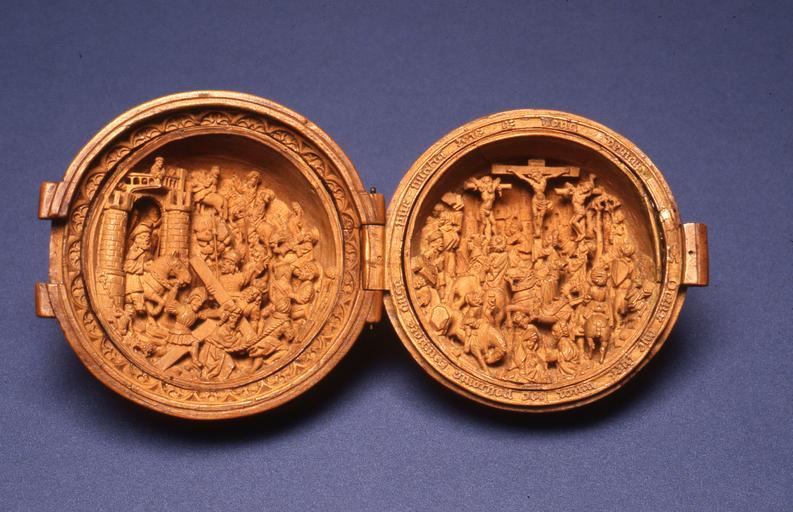| Keywords: Flemish - Rosary Bead with Scene of Christ Carrying the Cross - Walters 61131.jpg The rosary a string of beads used by Catholics as an aid in reciting specific prayers was an important tool for practicing personal private devotion Many highly crafted rosaries featured an additional pendant for which ivory and boxwood were popular materials because they could be so intricately carved Here the filigree resembles the tracery in late-Gothic church windows This bead opens to reveal scenes of Christ Carrying the Cross and the Crucifixion Even after the style was no longer in fashion and a rosary with this kind of pendant had been replaced as an aide to devotion by a more up-to-date rosary these pendants continued to be valued for the virtuosity of the carving on such a tiny scale between 1500 1525 Renaissance boxwood cm 4 9 diam accession number 61 131 25101 Henry Walters Baltimore date and mode of acquisition unknown Walters Art Museum Henry Walters Acquired by Henry Walters World of Wonder The Walters Art Gallery Baltimore 1971-1972 place of origin Belgium Walters Art Museum license Renaissance applied arts in the Walters Art Museum Flemish art in the Walters Art Museum Christian rosaries 16th-century wood carving Carved wooden objects Prayer nuts |