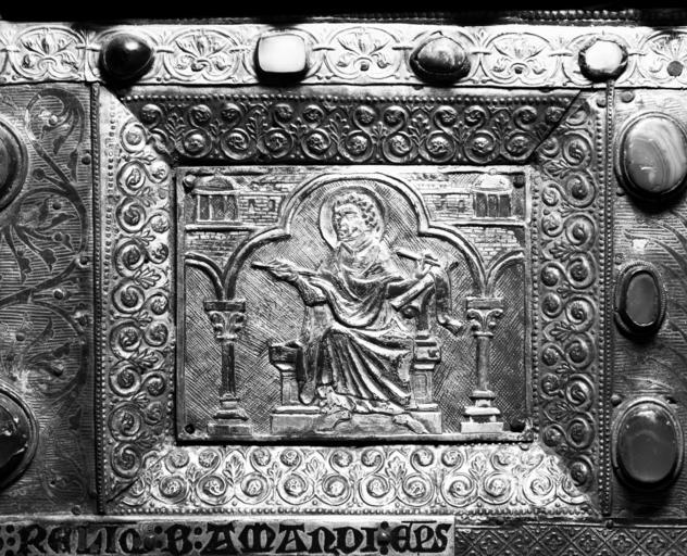 | Keywords: Flemish - Shrine of Saint Amandus - Walters 539 - Detail B.jpg This large church-shaped shrine once housed the relics of a 7th-century saint who served as a missionary and bishop to the western regions of present-day Belgium St Amandus d 679 also established a monastery at Elnon near Tournai western Belgium where the monks later commissioned this reliquary to honor his remains The shrine of St Amandus ornamented with silver columns and gilded apostles was the focus of a strong local cult visited by pilgrims who came for healing or in thanks for prayers answered Given its large size and popularity the shrine was probably placed upon a platform supported by columns behind the main altar for year-round veneration early 13th century with later additions Medieval wood oak gilded copper silver brass champlevé enamel cloisonné enamel rock crystal and semiprecious stones H at top of finials 19 1/4 x W 25 1/4 x D 11 15/16 in 48 9 x 64 14 x 30 32 cm accession number 53 9 22284 Brimo de Laroussilhe Paris date and mode of acquisition unknown Henri Daguerre Paris date and mode of acquisition unknown Henry Walters Baltimore September 3 1930 by purchase Walters Art Museum Henry Walters Acquired by Henry Walters 1930 Transcription In black enamel on gilt copper strips placed along the base of the roof-like lid IN ISTA CAPSA SVNT SEQVENTES RELIQ VIA E B EATI AMANDI EP ISCOPU S; Translation In this reliquary are the following relics of the blessed Bishop Amandus; Transcription In black enamel on gilt copper strip placed along the base of the roof-like lid PROESENTIS COMPOSITIVS Reliquaries and Ritual Medieval Objects of Devotion The Walters Art Gallery Baltimore 1984-1985 The Book of Kings Art War and the Morgan Library's Medieval Picture Bible The Walters Art Museum Baltimore; Academy of the Arts Easton Easton; Princeton University Art Museum Princeton; The Mitchell Gallery Annapolis; Williams College Museum of Art Williamstown 2002 The Special Dead A Medieval Reliquary Revealed The Walters Art Museum Baltimore 2008-2009 Treasures of Heaven The Cleveland Museum of Art Cleveland; The Walters Art Museum Baltimore; The British Museum London 2010-2011 place of origin Elnone Monastery in Tournai Belgium Walters Art Museum license Reliquary chest of Saint Amand Media contributed by the Walters Art Museum needs category review |