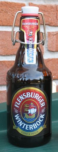Keywords: Flensburger Winterbock.jpg en A bottle of Flensburger Winterbock beer own Miguel Andrade 2012-03-03 Cc-zero Flensburger Bier Beer bottles brown glass Coats of arms of Flensburg