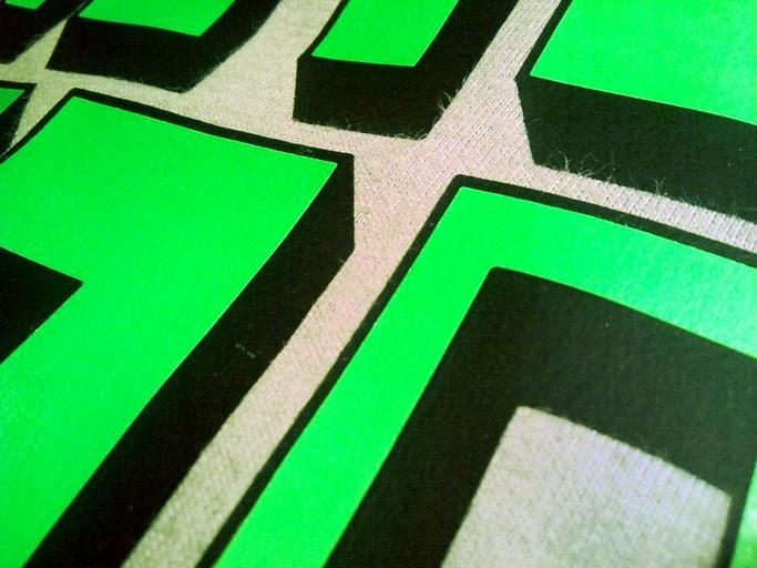 Keywords: Flex-foli neon-green black.jpg en Cotton fabric with a neon green and black flex-foil printing This closeup view is supposed to depict the smooth surface of flex-foils de Baumwollgewebe mit einem neon-grünen und schwarzen Flexfolien-Druck Diese Nahaufnahme soll die glatte Oberfläche von Flexfolien anschaulich machen own Stefan Nagy 2011-02-03 Cc-zero Printed textiles Plastic objects |