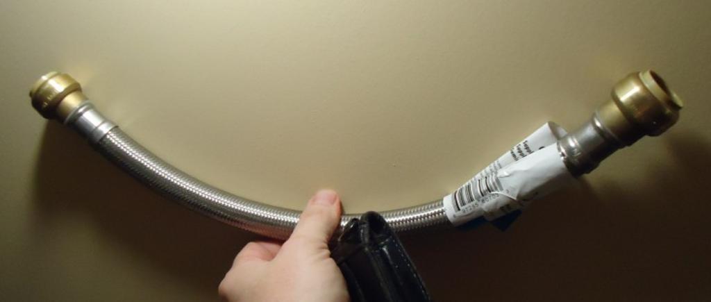 Keywords: Flex hose three fourths inch clamp on connector.jpg en This eighteen inch long flexible pipe connector has grips at each end allowing it to attach easily to a three-quarter inch pipe end 2012-08-08 own Tomwsulcer cc-zero Uploaded with UploadWizard Plumbing tools Handyman projects Hoses |