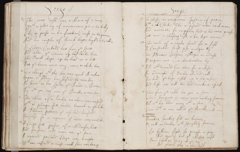| Keywords: Flickr - Beinecke Flickr Laboratory - (Poems), (ca. 1620-1640) (1).jpg Manuscript on paper in secretary hand containing over one hundred poems by Herrick Jonson Corbet Raleigh May Gill and many unidentified authors Page/Caption p 280-281 Songs ca 1620-1640 1 v 295 p 19 x 15 cm Subjects Corbet Richard 1582-1635 Gill Alexander 1597-1642 Herrick Robert 1591-1674 Jonson Ben 1573 -1637 May Thomas 1595-1650 English poetry Epigrams English Love poetry English Occasional verse English Verse satire English Genre Commonplace books Manuscripts Poems Cite as James Marshall and Marie-Louise Osborn Collection Beinecke Rare Book and Manuscript Library Yale University Repository Beinecke Rare Book Manuscript Library Yale University Bibliographic Record Number 2031702 Call Number Osborn b356 http //www flickr com/photos/25923731 N05/2436928224/ Poems ca 1620-1640 2008-04-23 09 22 http //www flickr com/people/25923731 N05 Beinecke Flickr Laboratory Flickr - Beinecke Flickr Laboratory - Poems ca 1620-1640 1 cropped jpg PD-old Secretary hand Manuscripts in the United States Images from the Beinecke Rare Book and Manuscript Library |