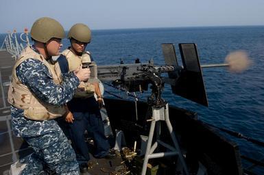 MAKE A MEME View Large Image Navy Imagery - A Sailor fires a .50 cal machine gun..jpg Atlantic Ocean June 21 2012 Sonar Technician Surface 1st Class Michael Miller fires a 50 cal machine gun as Gunner's Mate 2nd Class Michael Wakefield instructs during a training ...