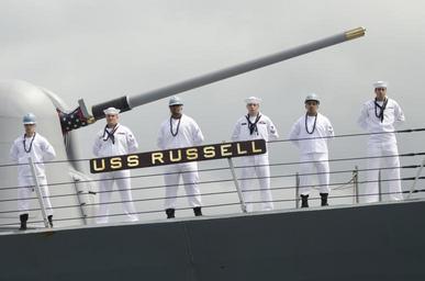 Keywords: Flickr - Official U.S. Navy Imagery - USS Russell arrives at Joint Base Pearl Harbor-Hickam..jpg JOINT BASE PEARL HARBOR-HICKAM April 23 2012 Sailors man the rails of the guided-missile destroyer USS Russell DDG 59 as the ship arrives at Joint Base Pearl Harbor-Hickam following completion of an eight-month deployment to the western Pacific and Arabian Gulf Russell and her crew of nearly 300 Sailors conducted a wide range of operations including ballistic missile defense maritime security operations and oil platform defense Additionally the ship and her crew participated in multi-national exercises with NATO allies and Gulf partner nations in support of theater security cooperation and operations U S Navy photo by Mass Communication Specialist 2nd Class Mark Logico/Released 120423-N-WP746-058 Join the conversation http //www facebook com/USNavy www facebook com/USNavy http //www twitter com/USNavy www twitter com/USNavy http //navylive dodlive mil navylive dodlive mil http //www flickr com/photos/usnavy/6967254108/ USS Russell arrives at Joint Base Pearl Harbor-Hickam 2012-04-23 11 08 http //www flickr com/people/56594044 N06 Official Navy Page from United States of America Mark Logico/U S Navy U S Navy photo PD-USGov-Military-Navy Official U S Navy Imagery http //flickr com/photos/56594044 N06/6967254108 2012-11-13 18 51 00 cc-by-2 0 Images from United States Navy to check