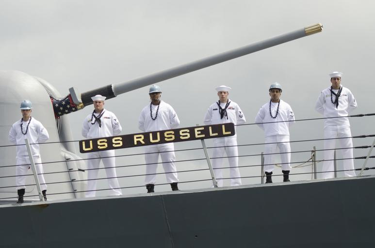 MAKE A MEME View Large Image Navy Imagery - USS Russell arrives at Joint Base Pearl Harbor-Hickam..jpg JOINT BASE PEARL HARBOR-HICKAM April 23 2012 Sailors man the rails of the guided-missile destroyer USS Russell DDG 59 as the ship arrives at Joint Base Pearl ...