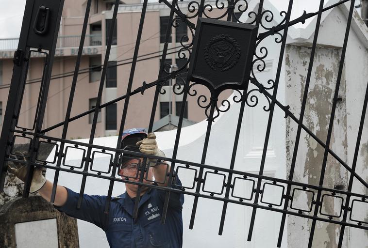 Keywords: Flickr - Official U.S. Navy Imagery - A Navy Diver moves the newly re-fabricated Commodore Oliver Perry cemetery gate into place at the Lapeyrouse Cemetery..jpg PORT OF SPAIN Trinidad and Tobago April 1 2012 Navy Diver 1st Class Brian Mouton assigned to Mobile Diving and Salvage Unit MDSU 2 Company 2-1 moves the newly re-fabricated Commodore Oliver Perry cemetery gate into place at the Lapeyrouse Cemetery The gates from the cemetery where Perry was first buried in 1819 were later dedicated to him in 1926 and have since fallen into disrepair Members of Company 2-1 and civilian crew members from the Military Sealift Command rescue and salvage ship USNS Grapple T-ARS 53 repaired the gate in time for the rededication ceremony on April 4 U S Navy photo by Mass Communication Specialist 2nd Class Kathleen A Gorby/Released 120401-N-BJ279-070 http //www flickr com/photos/usnavy/6901553154/ A Navy Diver moves the newly re-fabricated Commodore Oliver Perry cemetery gate into place at the Lapeyrouse Cemetery 2012-04-01 16 46 http //www flickr com/people/56594044 N06 Official Navy Page from United States of America MC2 KAHTLEEN GORBY/U S Navy Attribution License IPTC Caption-Abstract U S Navy photo PD-USGov-Military-Navy Official U S Navy Imagery http //flickr com/photos/56594044 N06/6901553154 2012-11-13 20 16 51 cc-by-2 0 Images from United States Navy to check Wrought iron |