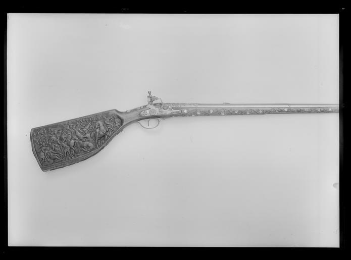 | Keywords: Flintlåsbössa av fransk-nederländsk typ ca 1650, stock av Johan Eberhart Sommer, Künzelsau - Livrustkammaren - 77798.tif Publius Cornelius Scipio Africanus konsul plain text Rund slätborrad pipa av stål godstjocklek vid mynningen 0 8 mm Åttsidig kammaren vid övergången en smal ring kanterna fasade 12 mm bakom ringen vid pipbasen likaså en profilerad vulst på de tre övre faserna Därframför ett dekorfält i stålsnitt l 110 mm nästan hela fältet förgyllt baktill ett snäckliknande ornament med två nedhängande bladfestonger Därframför tre ryttare alla i rustning den i mitten barhuvad fas fältherrestav i h hand den h ryttaren har stav i v hand och fana i h den v ryttaren likaså fana båda hjälmklädda Ornamentfältet framtill avslutad med liknande snäckornament med bladfestonger kompletterade med bladknippe i mitten Rektangulärt svansskruvblad svagt böjt med bladdekor i stålsnitt <br/>Riktmedel Hjärtformigt sikte av förgylld mässing stolpkorn av mässing <br/>Fästning Pipan fäst med krysskruv underifrån dold av avtryckarblecket samt tre pipstift av stål <br/><br/>Flintlås med plant låsbleck delvis något fasade kanter dekor i stålsnitt på låsblecket bakom hanen ryttare i 1600-talsdräkt med fältherrestav i bakgrunden stad till h om hanen tillbakaseende fältherre till häst i bakgrunden tält S-formig platt hane med små rundade käkar överkäken lös graverad och punsad drakdekor rundat koniskt käkskruvhuvud hanskruv med huvud täckande hela hankroppen stålsnittsdekor i form av blomma Fängpanna med liten fals på gaveln sicksackdekor Batteri med rektangulärt eldstål med rundad överkant liten profilering nertill på ryggen Batterifjäder utan studel litet sexflikigt fjäderlöv Nöt utan studel <br/>Fästning Två låsskruvar <br/>C-formig avtryckare Rektangulärt avtryckarbleck <br/><br/>Helstock av valnöt med kolv av tidig fransk typ På kolvens h och undersida snidad dekor på h sida stridsscen täckande hela sidan ryttare i antikiserande rustningar och i förgrunden till v en på marken sittande skäggig krigare som stöttas av två krigare och framför honom en yngre man som håller en häst vid tygeln Längs nederkanten en inskuren latinsk text Scipio cui magnum dives dedit Affrica nomen // pugnantem ad Trebia litus mane patrem samt i ny spalt till h Eximit ingenti pressum discrimine belli // Iam puer et tuta sub statione locat Scipio som det rika Afrika gav ett stort namn giver redan såsom gosse den tidigt vid Trebias strand kämpande fadern ett säkert hägn och borttager honom från det genom ofantliga faror tryckande kriget Längst till höger signering Iohan EberHart // Somer Kolvens undersida svagt rundad två rektangulära fält båda med krigare i helfigur det bakre med en man sedd snett bakifrån huvudet profil h på huvudet ett lejonhuvud med manen hängande ner på ryggen antik rustning och kort mantel h hand håller i oval sköld v arm upplyft och håller i stav Herkules Det främre fältets man likaså sedd snett bakifrån huvudet profil v antik rustning med hjälm o plym ingen mantel gehäng med svärd v hand vilar på höften h håller en på marken stödd sköld Framför de två fälten en i bladverk övergående maskaron Hela stocken i övrigt dekorerad med rankverk av silvertråd med blad och blommor av graverade pärlmorplattor På anslaget i rankverket dessutom 17 fåglar av olika slag däribland en uggla och fem påfåglar i mitten en med uppfälld stjärt Belag av graverat silver bakplåt fäst med sju stålspikar runt spikarna samt mitt på bakplåten graverade blad Två släta rörkor samt näsband med blomdekor Varbygel av stål med korta släta armar främre stolpen kluben och främre armen har del även bakom stolpen litet flikigt löv baktill På bygeln en hillebardiär i låg relief <br/><br/>Tillbehör <br/>Laddstock av stockens trä l 1142 mm framtill skodd med silver l 27 mm med geometrisk dekor I andra änden spår av annat beslag original caption ca 1650 walnut e3 - eldvapen - stock material valnöt - steel e127 - eldvapen - pipa lås och stockbeslag material stål - silver thread e8 - eldvapen - stockdekor material silvertråd - silver e7 - eldvapen - stockbeslag material silver - mother-of-pearl e8 - eldvapen - stockdekor material pärlemor - brass e4 - eldvapen - riktmedel material mässing g 2520 size mm 1162 pipa size mm 1555 LRK Künstlerfamilie Sommer 1985 Scipio cui magnum dives dedit Affrica nomen // pugnantem ad Trebia litus mane patrem // Eximit ingenti pressum discrimine belli // Iam puer et tuta sub statione locat anv e3 - eldvapen - stock; Elin Thegerström Iohan EberHart // Somer anv e8 - eldvapen - stockdekor; Johan Eberhard Sommer Scipio cui magnum dives dedit Affrica nomen // pugnantem ad Trebia litus mane patrem // Eximit ingenti pressum discrimine belli // Iam puer et tuta sub statione locat anv e3 - eldvapen - stock; Elin Thegerström Iohan EberHart // Somer anv e8 - eldvapen - stockdekor; Johan Eberhard Sommer place of origin original filename LN_B04659_007539 55357 inventory number LRK 18794 77798 CC0 Flintlåsbössa av fransk-nederländsk typ ca 1650 stock av Johan Eberhart Sommer Künzelsau - Livrustkammaren - 77798-negative tif <gallery caption Different images of same object > File Flintlåsbössa av fransk-nederländsk typ ca 1650 stock av Johan Eberhart Sommer Künzelsau - Livrustkammaren - 43890 tif File Flintlåsbössa av fransk-nederländsk typ ca 1650 stock av Johan Eberhart Sommer Künzelsau - Livrustkammaren - 81541 tif File Flintlåsbössa av fransk-nederländsk typ ca 1650 stock av Johan Eberhart Sommer Künzelsau - Livrustkammaren - 64420 tif File Flintlåsbössa av fransk-nederländsk typ ca 1650 stock av Johan Eberhart Sommer Künzelsau - Livrustkammaren - 72982 tif File Flintlåsbössa av fransk-nederländsk typ ca 1650 stock av Johan Eberhart Sommer Künzelsau - Livrustkammaren - 13151 tif File Flintlåsbössa av fransk-nederländsk typ ca 1650 stock