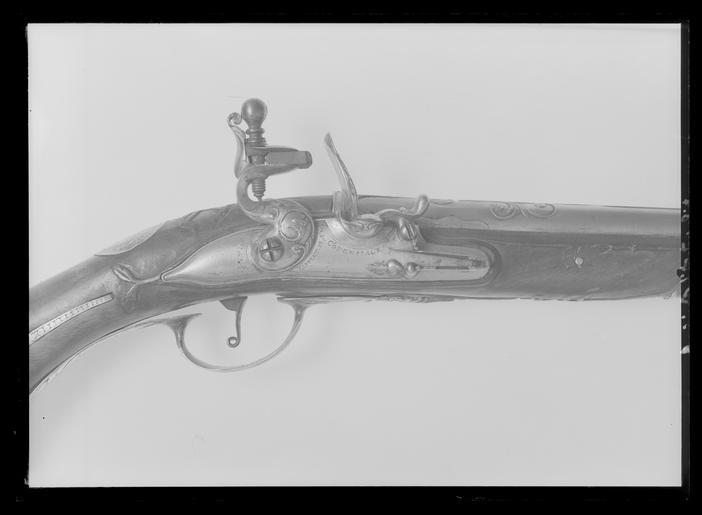 Keywords: Flintlåspistol, Hans Zimmerman, silverbeslag troligen av Daniel Schwarzkopf - Livrustkammaren - 18412.tif Rund slätborrad pipa av stål kammarens bakre del kantig överfasen avbruten av snidade blad och voluter och fortsätter som en plan list fram till kornet samt med ett blad fram till mynningen Böjt svansskruvblad med rundad ände bakom skruvhålet inhugget 4 <br/>Riktmedel Vid pipbasen en profilerad vulst infilad siktskåra Spolformigt korn av silver <br/>Fästning Två häften pipan fäst med krysskruv samt ett urspr två pipstift av stål <br/><br/>Flintlås av stål med välvt låsbleck med smal kantlist graverad dekor i form av dubbla kantlinjer Graverad signatur följande hanens och fängpannans rundningar HANS // ZIMMERMAN // COPENHAGEN S-formigt svängd rundad hane med kantlist och rankdekor med drakhuvud i stålsnitt Hanskruv med x-skåra Runda käkar överkäken låg och blånerad blånerad käkskruv med balusterformigt huvud Rundad fängpanna med skålad fals blad i stålsnitt på ytteränden Batteri med välvt fängpannelock och eldstål på eldstålet kantlister och bladvolut i stålsnitt Batterifjäder med delvis fasade kanter bladdekor bet-formigt fjäderlöv <br/>Fästning Två låsskruvar <br/>Avtryckare med upprullad ände Konturerat avtryckarbleck av blånerat stål <br/><br/>Helstock av valnöt med sliten snidad bladdekor vid svansskruvbladet snidade grenar Näsband av horn Beslag av silver Kolvkappa med långa flikar på kolvsidorna blad- och pärlstavsdekor släta kantlister Oval centrumplatta med lejonmaskaron i relief på plattans insida en silverstav fäst med skruv från varbygelurtaget Under centrumplattan på kolvkappan delvis otydliga silverstämplar otydligare än på nr 4709 Köpenhamn 170 guardein-stämpel CLWM Conrad Ludolf 1679-1729 månadsstämpeln saknas delvis utplånad mästarstämpel D K Böje nr 315 Daniel Schwarzkopf 1699-1727 Oval slät tumplåt med graverat vapen delvis bortslitet krönt med furstligkrona sköldhållare två lejon Hjärtsköld Oranien-Chalon-Geneve åtföljd av ovan Meurs och nedan Bueren Fält 1 Nassau 2 Katzenellenbogen 3 Vianden 4 Dietz 5 Spiegelberg 6 Liessfeldt Sidbleck i form av ett genombrutet rankverk med drakhuvud En + en profilerad rörka slät spets med graverade blad Varbygeln välvd med kantlister främre armen 8-formig med symmetriskt genombrutet ändblad lång bakre arm med rundad ände blad i relief mittpå bakre armen graverat N 4 original caption - 1702 1711 steel e127 - eldvapen - pipa lås och stockbeslag material stål - silver e47 - eldvapen - riktmedel och stockbeslag material silver - walnut e3 - eldvapen - stock material valnöt - horn e7 - eldvapen - stockbeslag material horn size mm 470 size mm 289 pipa g 960 LRK Johan Wilhelm Friso Nassau-Dietz prins Fredrik I av Sverige C L M W anv e7 - eldvapen - stockbeslag; Condrad Ludolf HANS ZIMMERMAN COPENHAGEN anv e2 - eldvapen - lås; Hans Christian Zimmermann Timmermand C L M W anv e7 - eldvapen - stockbeslag; Condrad Ludolf HANS ZIMMERMAN COPENHAGEN anv e2 - eldvapen - lås; Hans Christian Zimmermann Timmermand place of origin original filename LN_B10032_012912 41225 inventory number LRK 4710 18412 CC0 Flintlåspistol Hans Zimmerman silverbeslag troligen av Daniel Schwarzkopf - Livrustkammaren - 18412-negative tif Flintlock pistol Images from Livrustkammaren Media contributed by LSH dim-with multiple size templates Media contributed by LSH unmatched creator Media contributed by LSH 2013-10 |